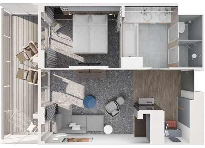 | JKBO - Junior Suite s balkónom B 26 m² + balkón 7 m² so stoličkami a podnožkami. 8-12. paluba. Max 4 osoby. Výhody Junior Suite. | 5 307 € 1 769 € za osobu | ||